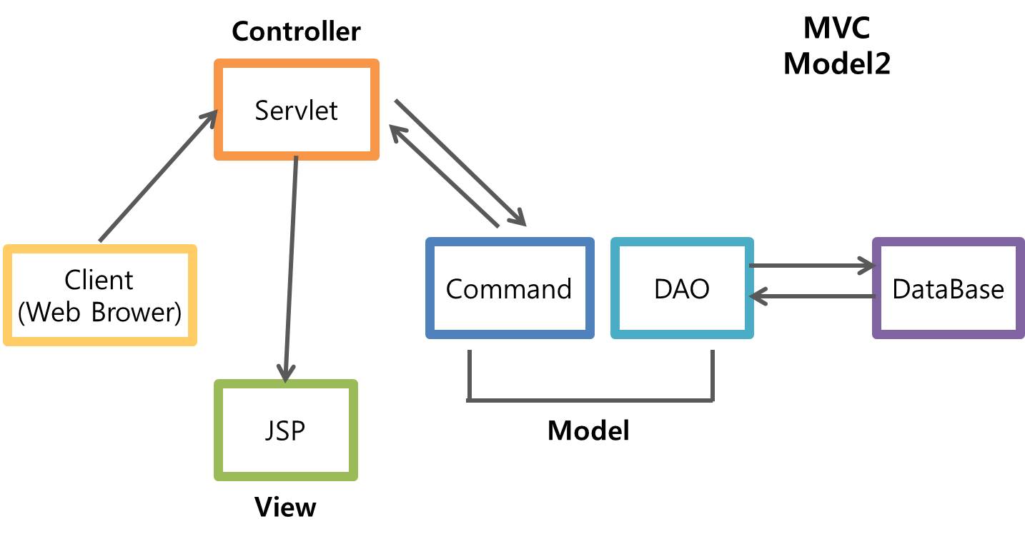 | Model 2 | 로직코드와 View 코드의 분리에 따른 유지보수의 편리함 Controller Servlet에서 집중적인 작업처리 가능 확장의 용이함 |