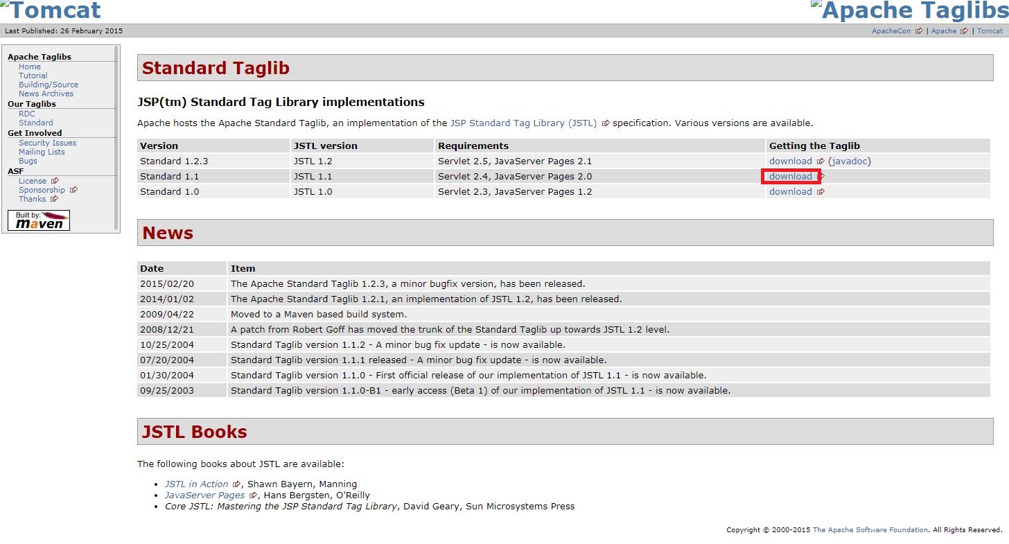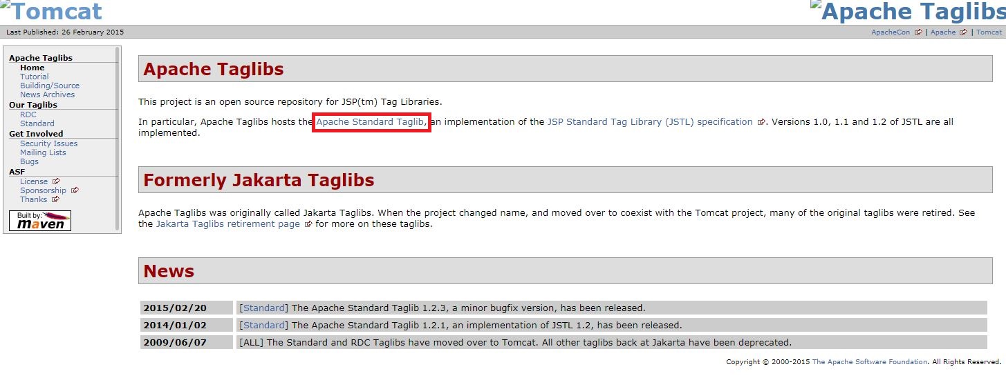 위의 해당 페이지로 접속한 후 좌측의 Taglibs를 클릭합니다.