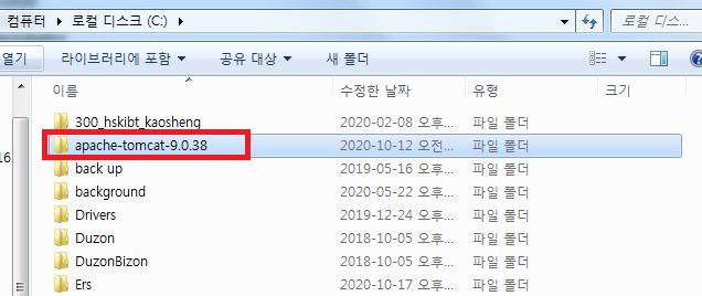 6. c드라이브의 apache-tomcat-9.0.38 폴더를 선택합니다.