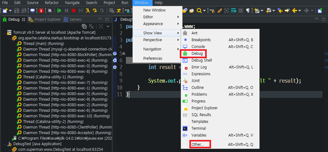 ② Window - Show View - Debug 혹은 없다면 Other...를 클릭하여 동일하게 진행합니다.