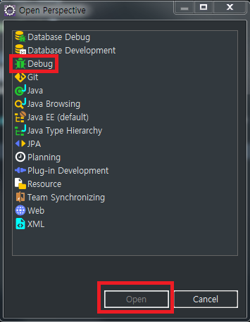 Open Perspective 내 Debug를 찾아 클릭하면 됩니다.