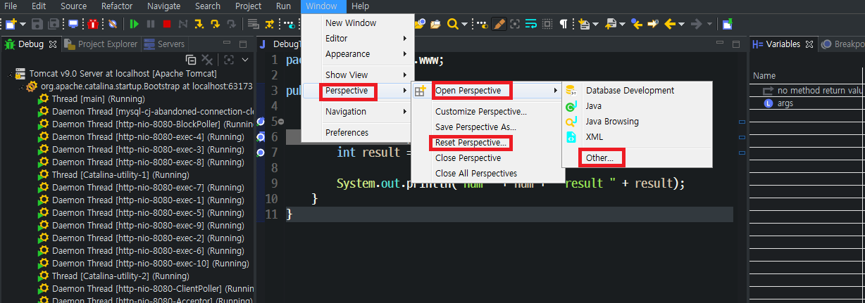 ① window - Perspective - Reset Perspective... - Open Perspective - Other 순으로 진행한다.
