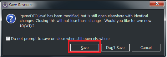 1. Eclipse에서 디버그모드(F11)를 실행한 후 아래와 같이 알림창이 뜨는 경우 Save를 클릭합니다.