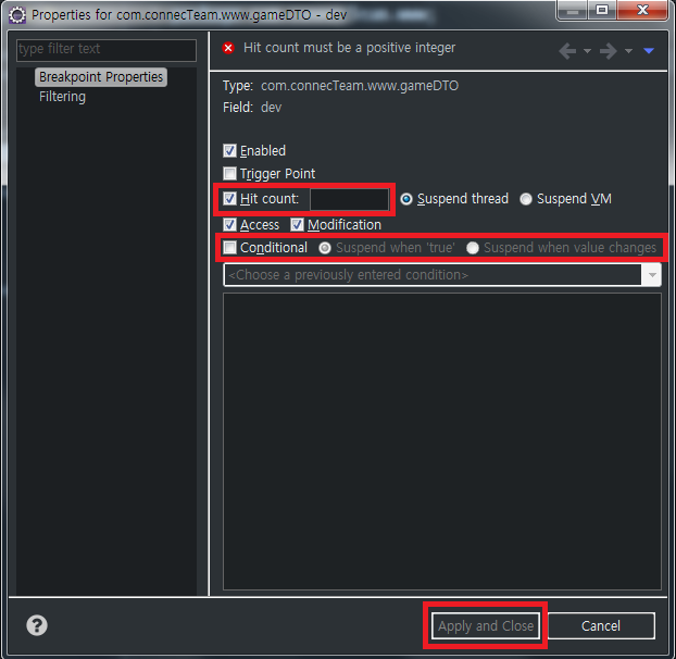 // 브레이크 포인트 - 우클릭 - Properties