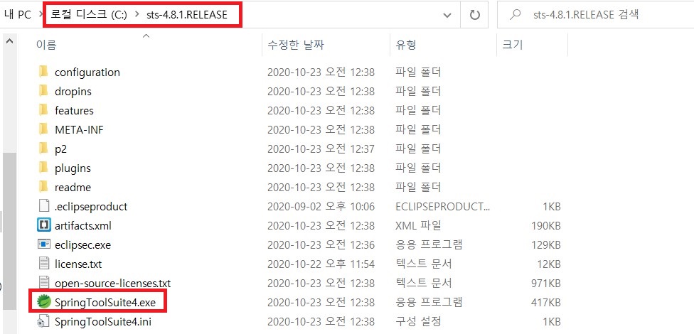7. 복사했던 폴더를 로컬 디스크(C:)에 붙여넣기 한 후 해당 폴더 내의 SpringToolSuite4.exe 파일을 클릭 해줍니다.
