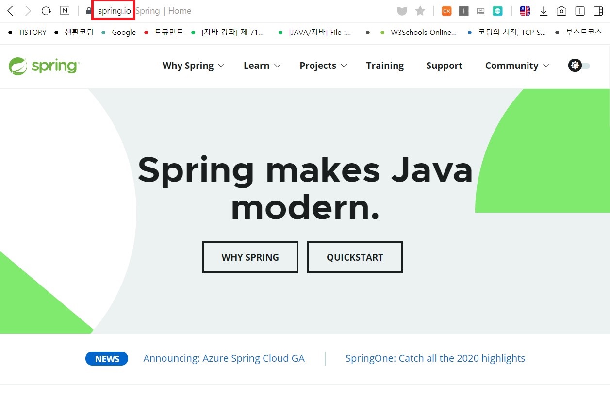 1. 주소창에 spring.io를 검색하여 아래와 같이 해당 페이지를 엽니다.