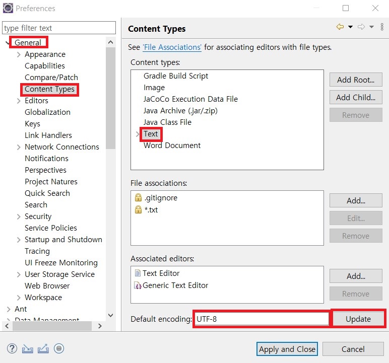 14. Default encoding 옵션 중 UTF-8를 선택한 후 Update를 클릭합니다.