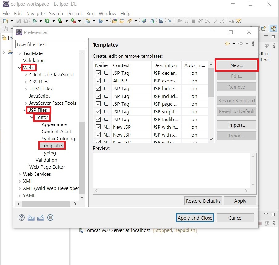 2. 좌측에서 Web - JSP Files - Editor - Templates 순으로 클릭한 후 New...를 클릭합니다.