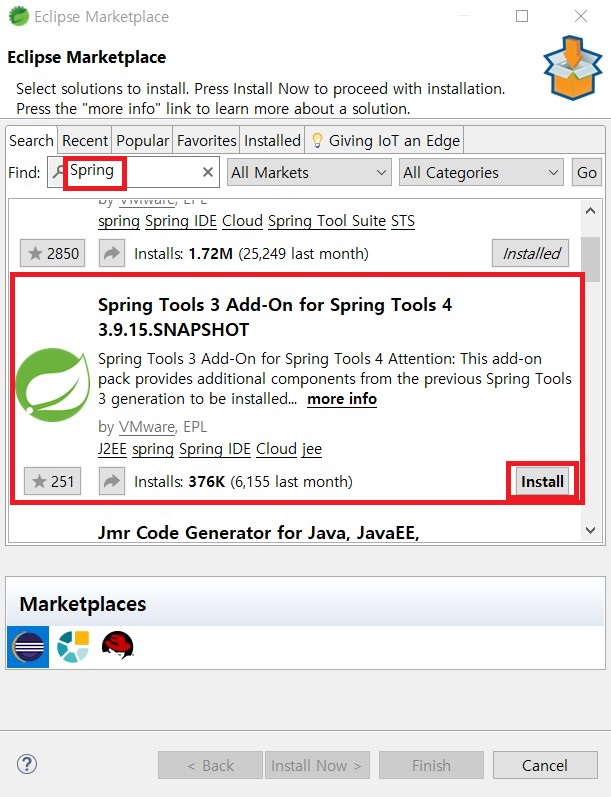 10. 검색창에 Spring을 입력한 후 아래의 제목을 확인하여 Install을 클릭합니다.