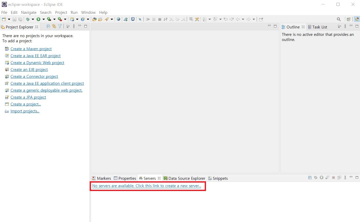 "No servers are available. Click this link to create a new server..." 을 클릭합니다.
