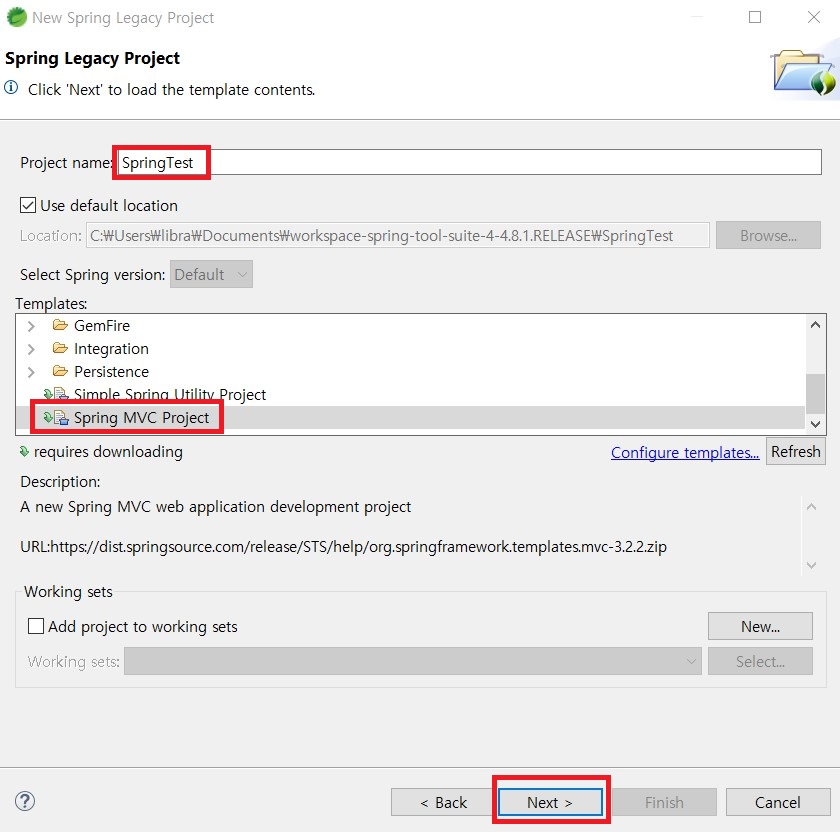 3. 아래와 같이 사용하실 프로젝트명을 입력한 후 Spring MVC Project를 선택한 뒤 Next를 클릭합니다.