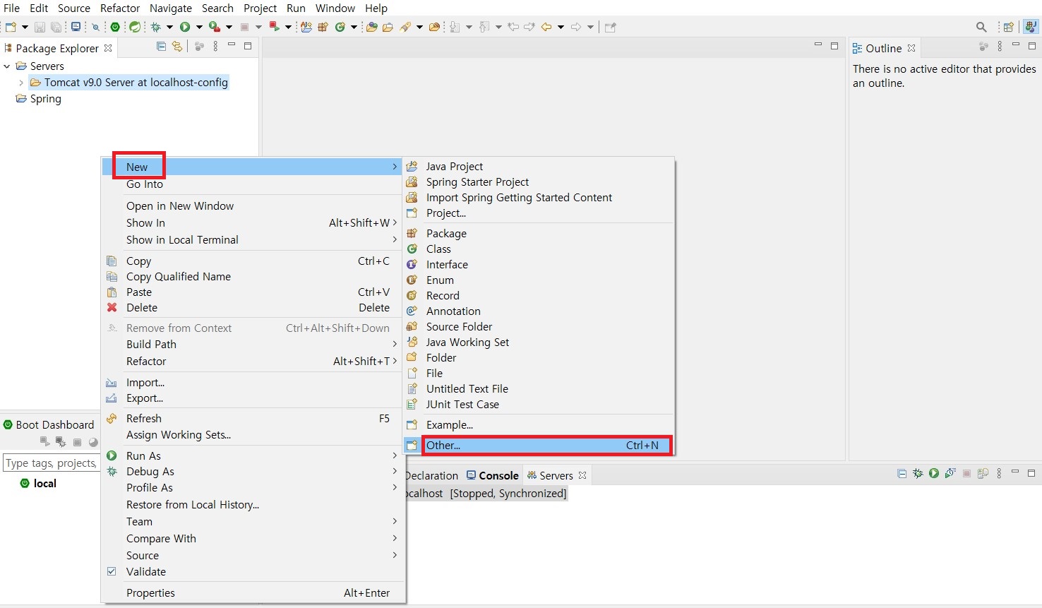 1. Package Explorer에서 우클릭 후 new - other 를 선택합니다.