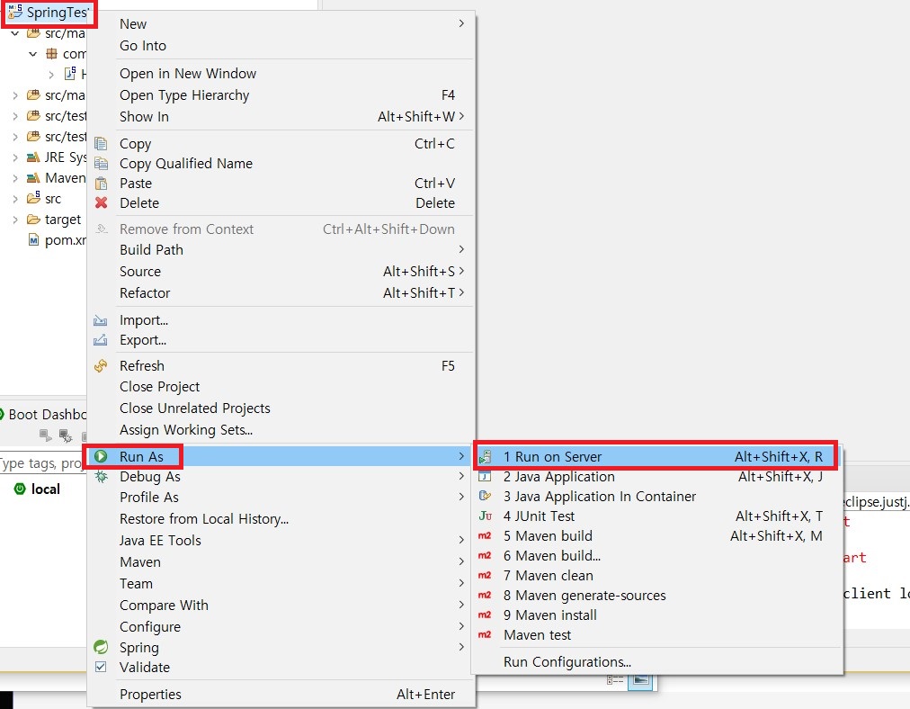 1. 해당 프로젝트 선택 후 우클릭 - Run As - Run on Server을 클릭합니다.