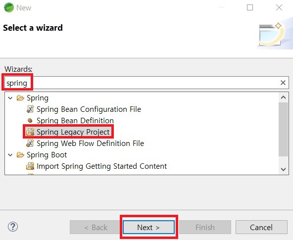 2. "spring"을 입력한 후 Spring Legacy Project를 선택한 뒤 Next를 클릭하세요.