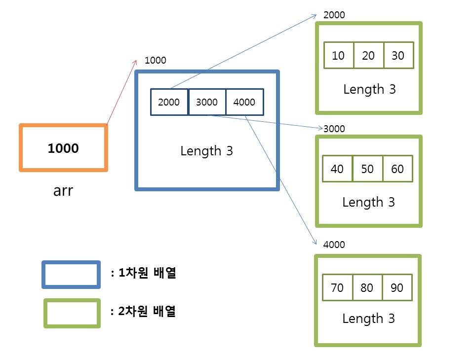 - 자바에서는 2차원 배열에서 행의 길이가 다른 배열 문법적으로 가능함 (c나 c++은 안 됨)