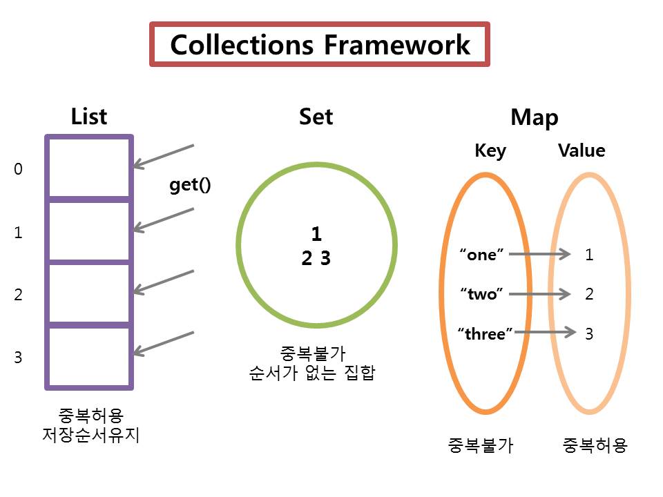 | List<E> | 순서가 있는 데이터의 집합으로, 데이터의 중복을 허용 |