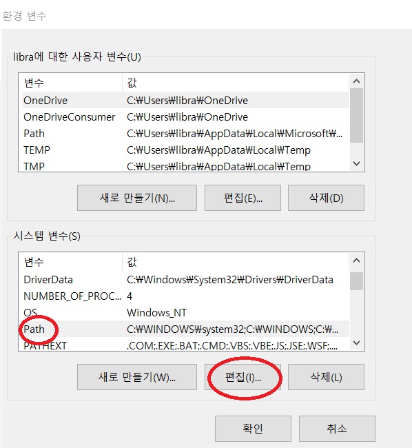5. 환경 변수에서 하단의 시스템 변수 중 Path를 클릭한 후 편집에 들어가줍니다.