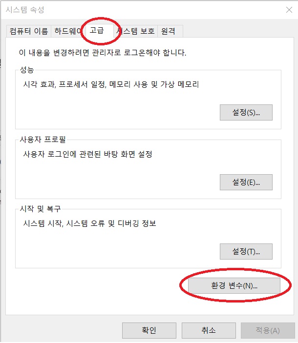 4. 고급에서 우측 하단에 있는 환경 변수를 클릭해줍니다.