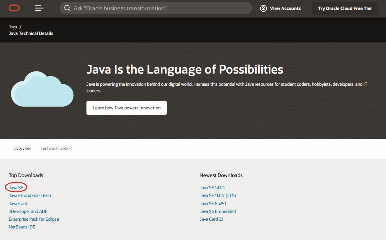 2. 자바 홈페이지에서 최하단으로 내려가 Top Downloads 아래의 Java SE를 클릭합니다.