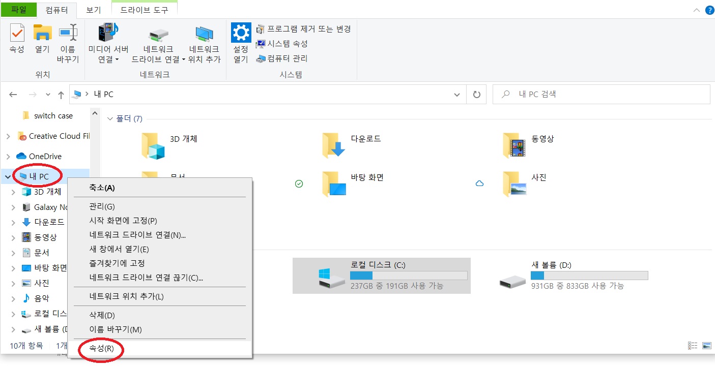 2. 내pc에서 마우스 우클릭 하여 속성을 클릭해줍니다.