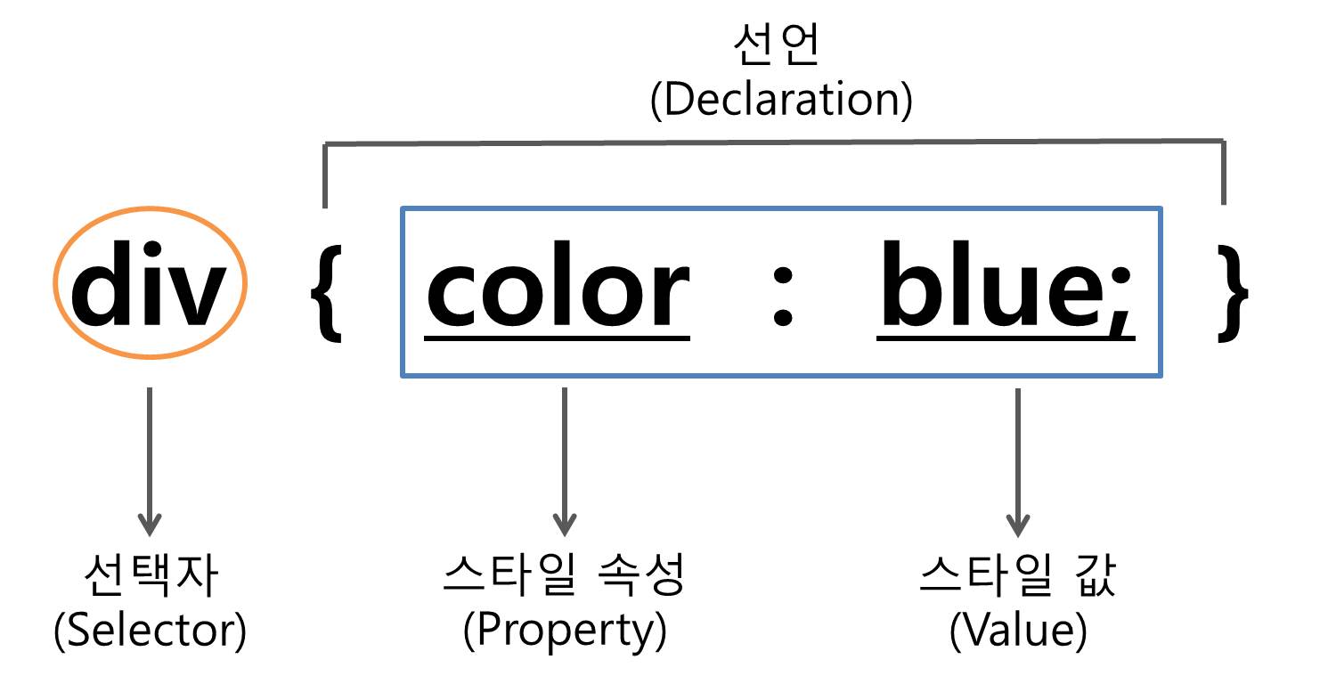 | 태그 선택자 | 태그명{ 스타일 속성 : 스타일 값;} | div{color : blue;} | |