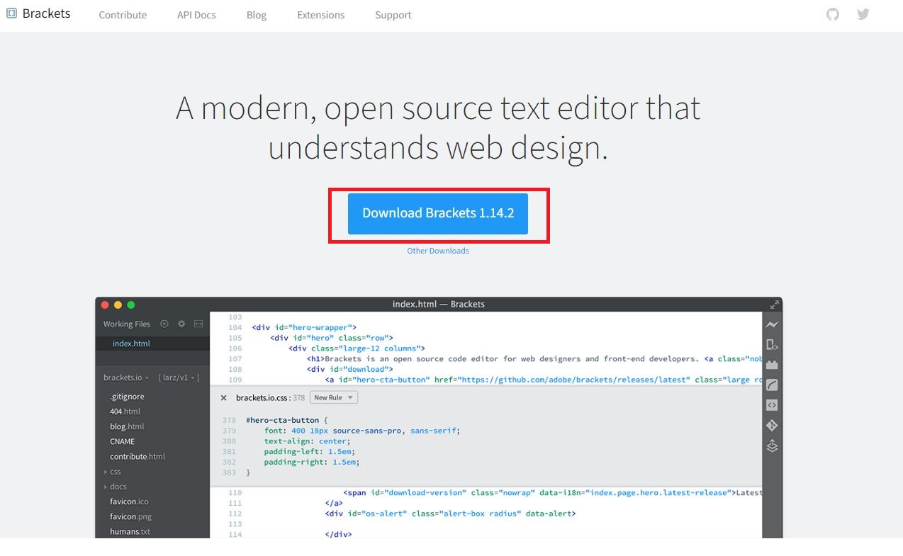 2. brackets 홈페이지에서 Downloads를 클릭합니다.