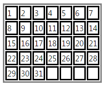 5행 7열짜리 테이블을 만들고 각각의 칸에 1부터 31까지 1씩 증가시킨 값을 넣는다.