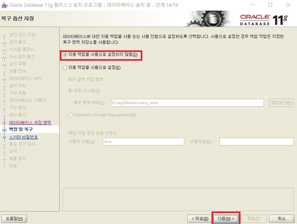 26. 자동 백업을 사용으로 설정하지 않음을 선택한 후 다음을 클릭합니다.