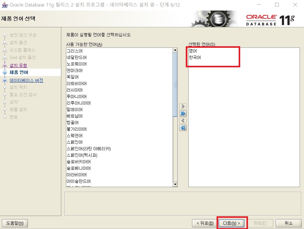 15. 선택된 언어에 영어, 한국어가 있는지 여부를 확인한 후 다음을 클릭합니다.