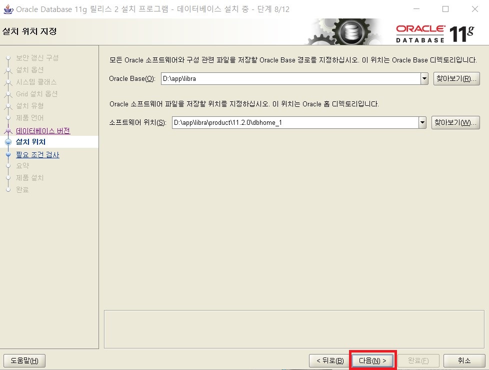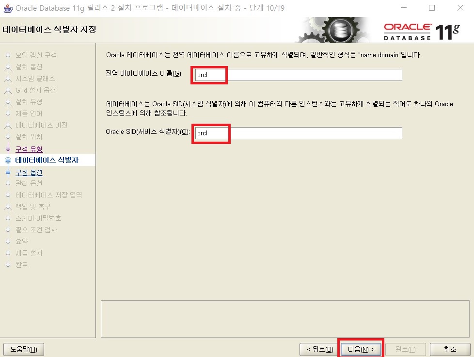 19. 두 칸 모두 orcl로 입력한 후 다음을 클릭합니다.
