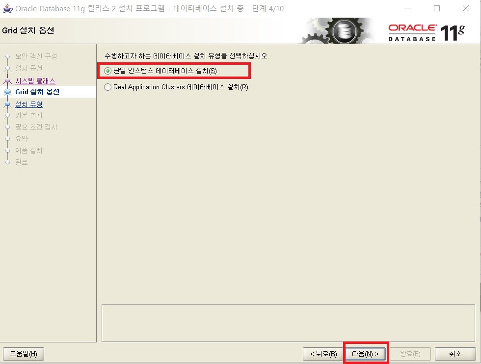 13. 단일 인스턴스 데이터베이스 설치를 선택한 후 다음을 클릭합니다.