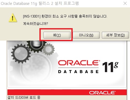 8. 아래와 같이 환경이 최소 요구 사항을 충족하지 않는다는 경고창이 뜨더라도 예(Y)를 눌러주시면 됩니다.