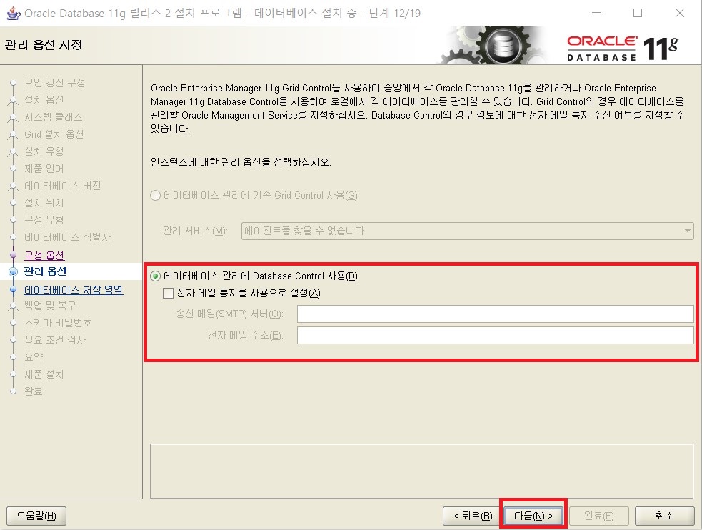 24. 데이터베이스 관리에 Database Control 사용을 선택한 후 다음을 클릭합니다.