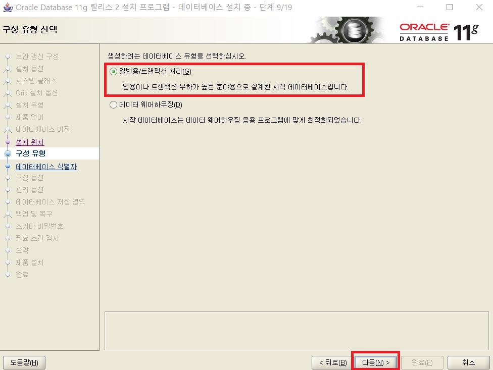 18. 데이터베이스 유형 중 일반용/트랜잭션 처리를 선택한 후 다음을 클릭합니다.