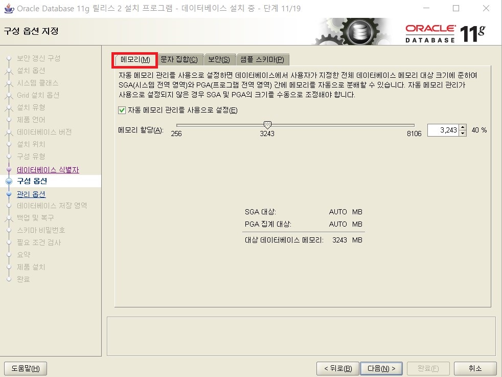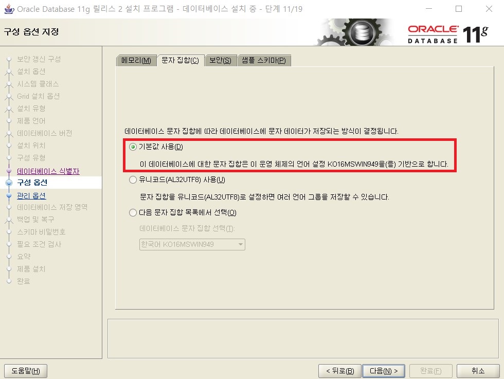 20. 메모리 부분은 따로 건드리지 않고 문자 집합을 클릭합니다.