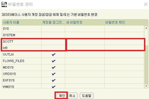 34. 아래의 사용자 이름 리스트 중 SCOTT과 HR의 계정을 잠그겠습니까 부분의 체크를 해제해주시고,