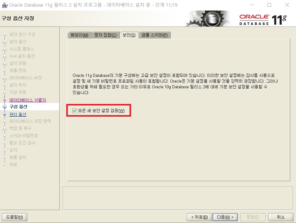 22. 모든 새 보안 설정 검증 선택 여부 확인 후 샘플 스키마를 클릭합니다.