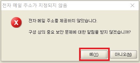 10. 전자 메일을 입력하지 않은 경우 아래의 메시지가 뜨나 예(Y)를 누르시면 됩니다.