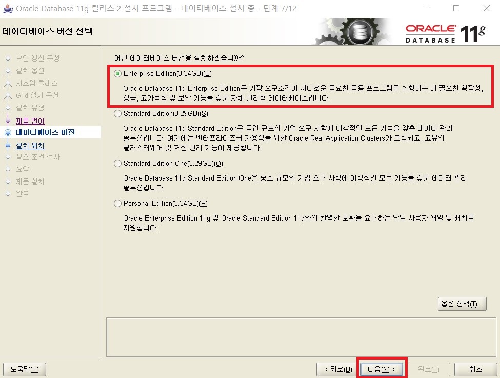 16. 데이터베이스 버전 중 Enterprise Edition(3.34GB)를 선택한 후 다음을 클릭합니다.