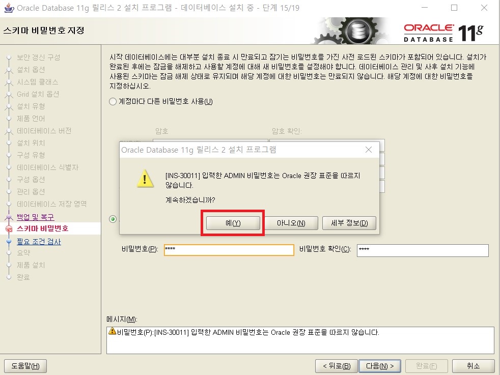28. 아래와 같이 권장 표준을 따르지 않는다는 경고가 떠도 예(Y)를 클릭하시면 됩니다.