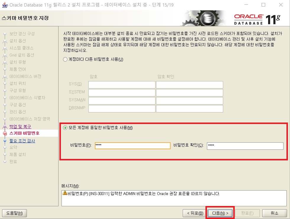 27. 모든 계정에 동일한 비밀번호 사용을 선택한 후 원하는 비밀번호를 동일하게 입력합니다.