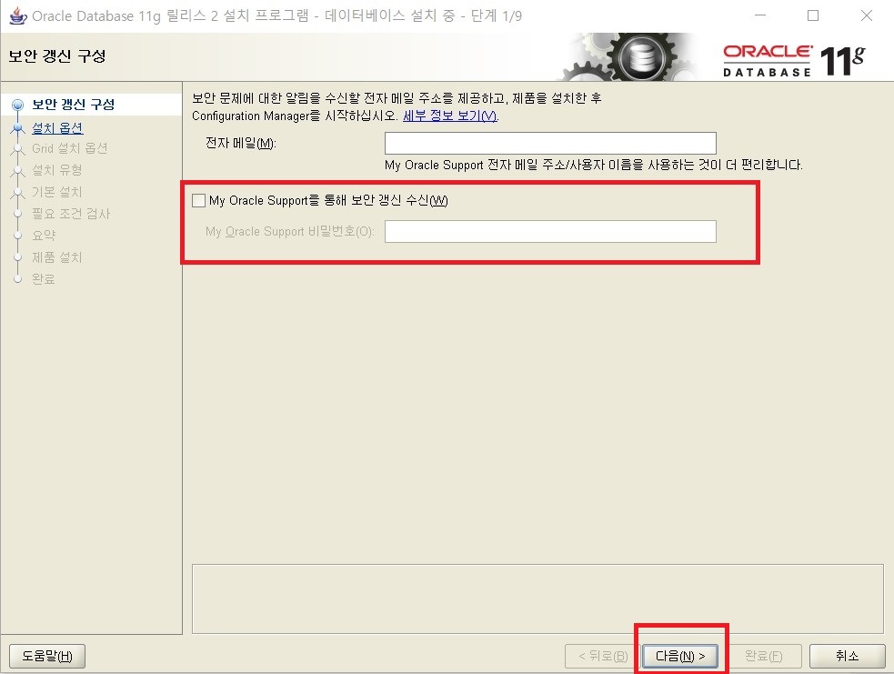 My Oracle Support를 통해 보안 갱신 수신 부분의 체크를 해제하고 다음을 클릭합니다.