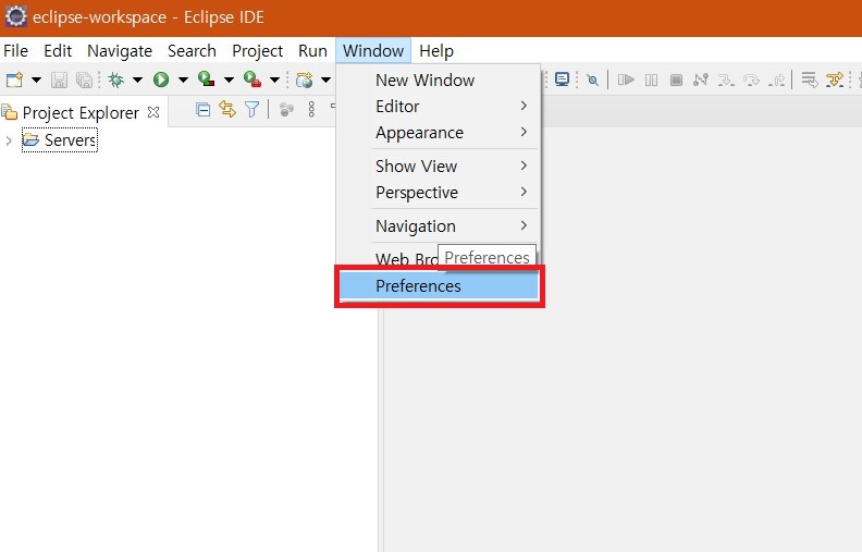 1. 상단의 Window - Preferences를 클릭합니다.