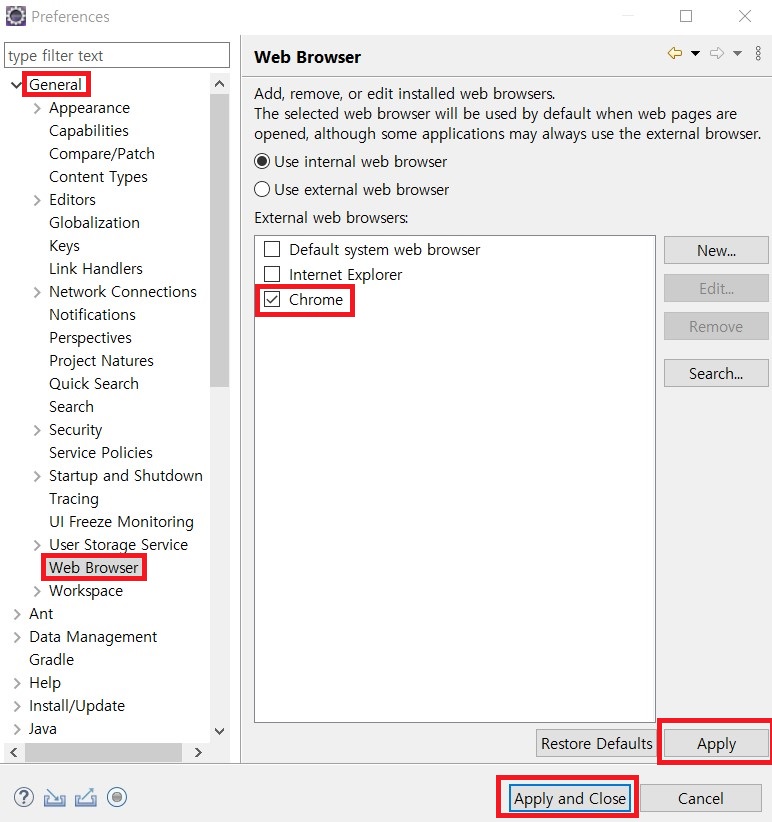 2. External web browsers 중 Chrome을 체크해줍니다.