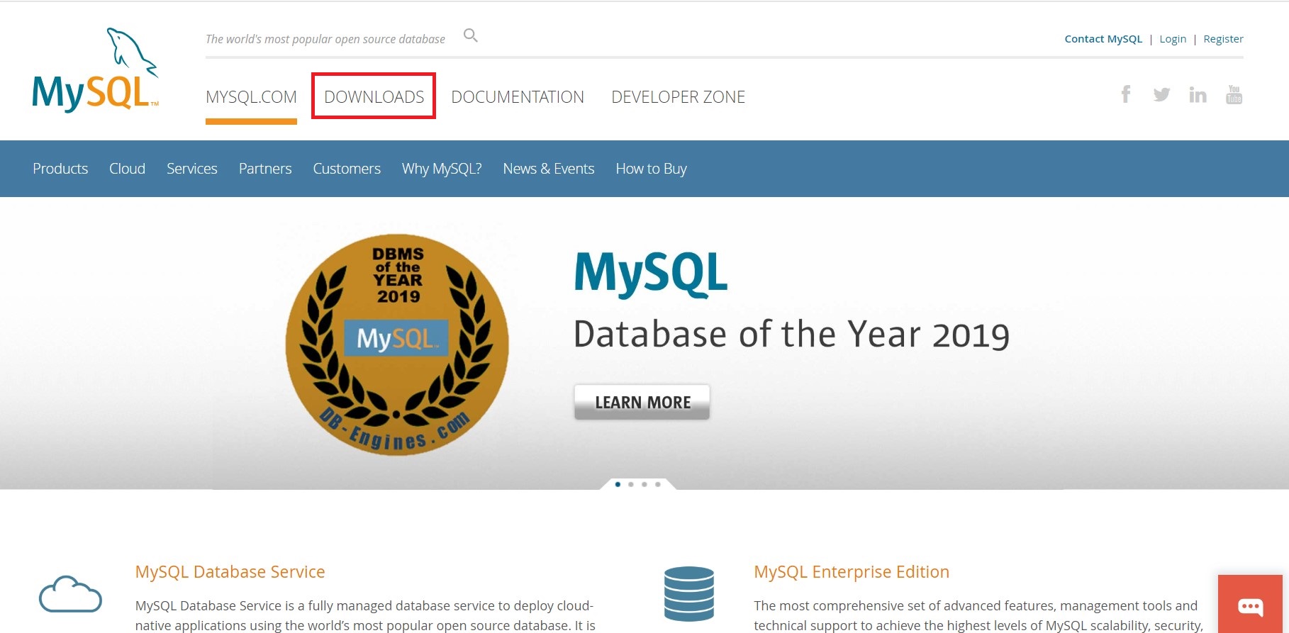 1. https://www.mysql.com에 들어가 상단의 DOWNLOADS 버튼을 클릭합니다.