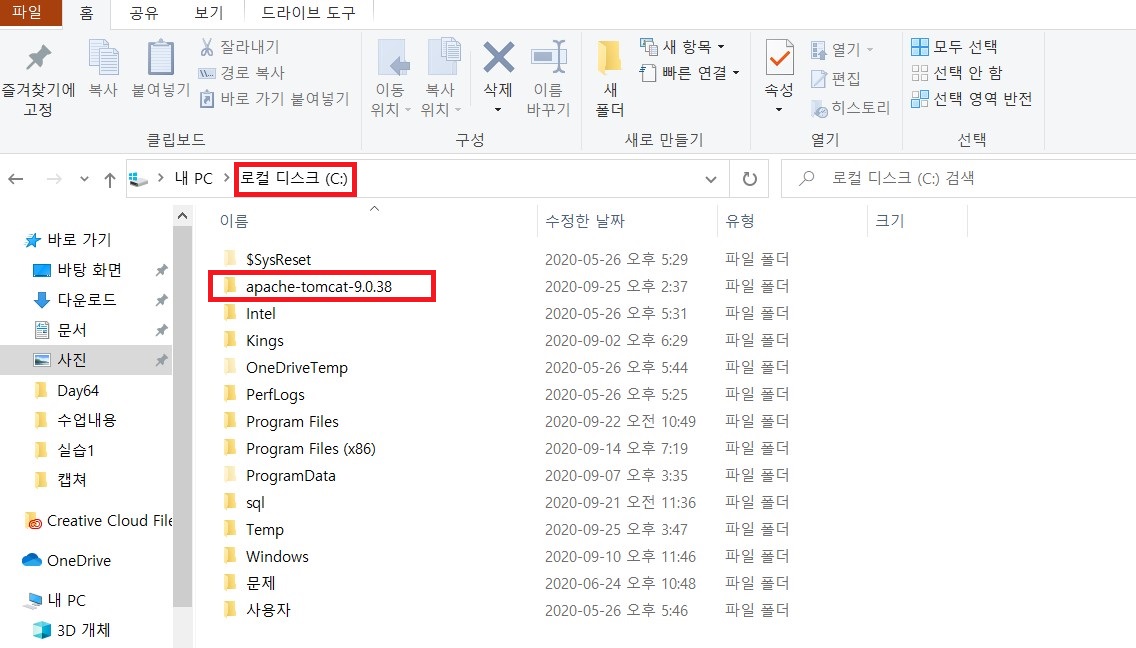 C 드라이브에 압축을 푼 apache-tomcat-9.0.38 폴더를 붙여넣기 해줍니다.