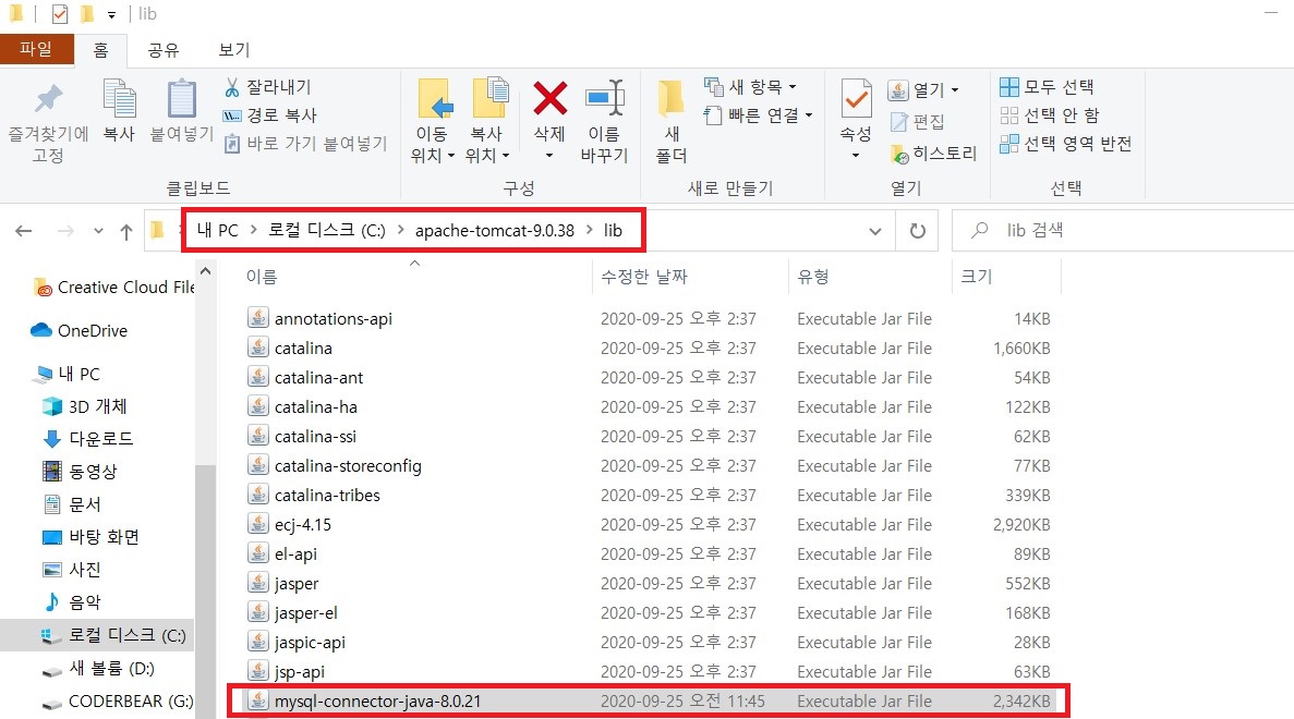 mysql-connector-java-8.0.21 파일을 복사하여 아래의 주소 폴더로 가 붙여넣기 해줍니다.