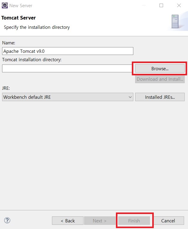3. Browse...를 클릭한 후 미리 다운 받은 apache-tomcat-9.0.38 폴더를 찾아 폴더선택을 클릭하고