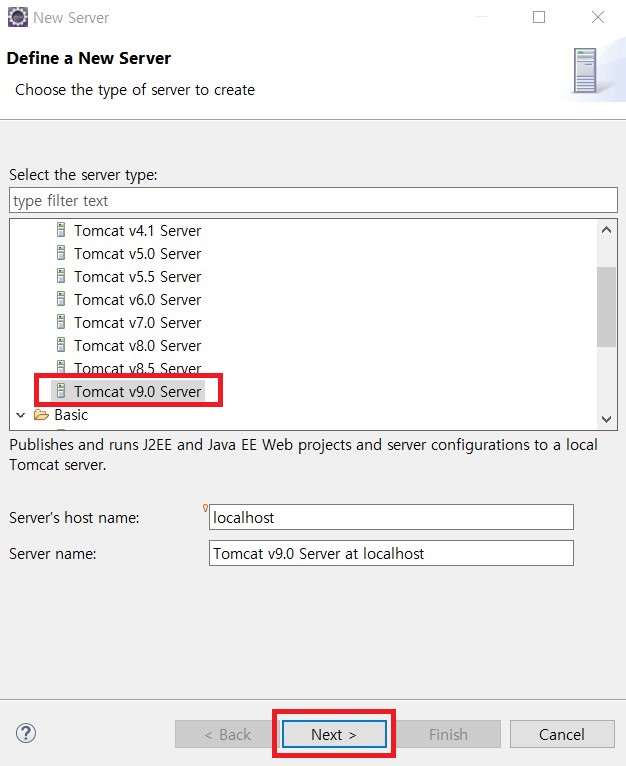 2. apache 폴더 중 Tomcat v9.0 Server를 선택한 후 Next를 클릭합니다.