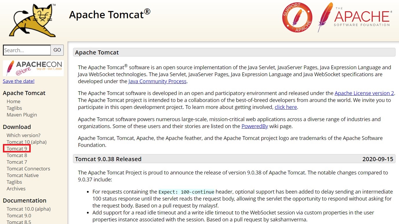 2. 사이트의 좌측 메뉴 중 Download 중 Tomcat 9을 클릭합니다.
